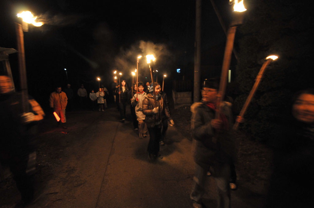 子供たちと近所の神社にお参り。神社でたいまつに火をつけてやぐらのあるところまでみんなで火を運びます。これは毎年小学5・6年生の役目。