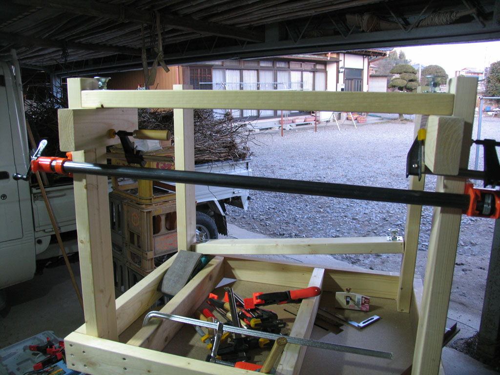 さていよいよ天板の張り合せ。中央部はメンテナンスのことも考えてボンド止めはやめてビス止めにする予定です。両サイドのみボンドをつけてクランプで圧着しました。クランプが安物のためか、締めつけると板がずれてしまいます。何度か調整しながらようやくぴったりと収まりました。