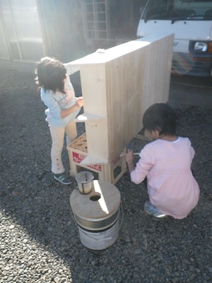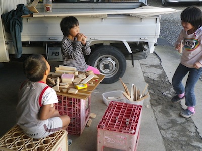 作業場に行くと、末娘が近所の仲良しさんを連れて来て、お得意の端材で積み木遊びを始めました。小さい子が3人集まると、下手気な電動工具よりやかましいですヾ(;´▽`A``